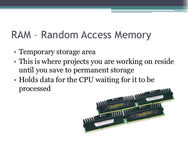 - 9. RAM – Random Access Memory • Temporary storage area • This is where projects you are working on reside until you save to permanent storage • Holds data for the CPU waiting for it to be processed