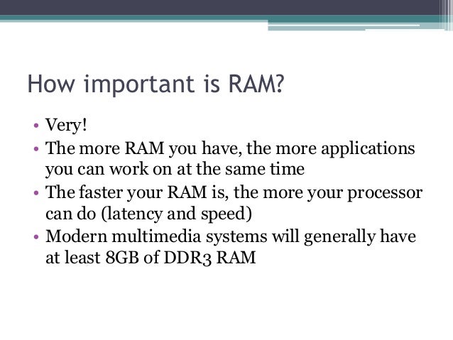 - 10. How important is RAM? • Very! • The more RAM you have, the more applications you can work on at the same time • The faster your RAM is, the more your processor can do (latency and speed) • Modern multimedia systems will generally have at least 8GB of DDR3 RAM