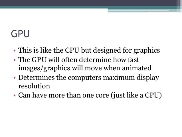 - 11. GPU • This is like the CPU but designed for graphics • The GPU will often determine how fast images/graphics will move when animated • Determines the computers maximum display resolution • Can have more than one core (just like a CPU)