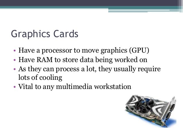 - 12. Graphics Cards • Have a processor to move graphics (GPU) • Have RAM to store data being worked on • As they can process a lot, they usually require lots of cooling • Vital to any multimedia workstation