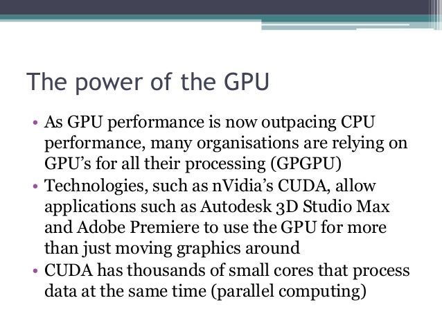 - 13. The power of the GPU • As GPU performance is now outpacing CPU performance, many organisations are relying on GPU’s for all their processing (GPGPU) • Technologies, such as nVidia’s CUDA, allow applications such as Autodesk 3D Studio Max and Adobe Premiere to use the GPU for more than just moving graphics around • CUDA has thousands of small cores that process data at the same time (parallel computing)