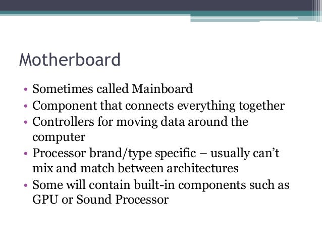 - 14. Motherboard • Sometimes called Mainboard • Component that connects everything together • Controllers for moving data around the computer • Processor brand/type specific – usually can’t mix and match between architectures • Some will contain built-in components such as GPU or Sound Processor