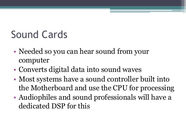 - 15. Sound Cards • Needed so you can hear sound from your computer • Converts digital data into sound waves • Most systems have a sound controller built into the Motherboard and use the CPU for processing • Audiophiles and sound professionals will have a dedicated DSP for this