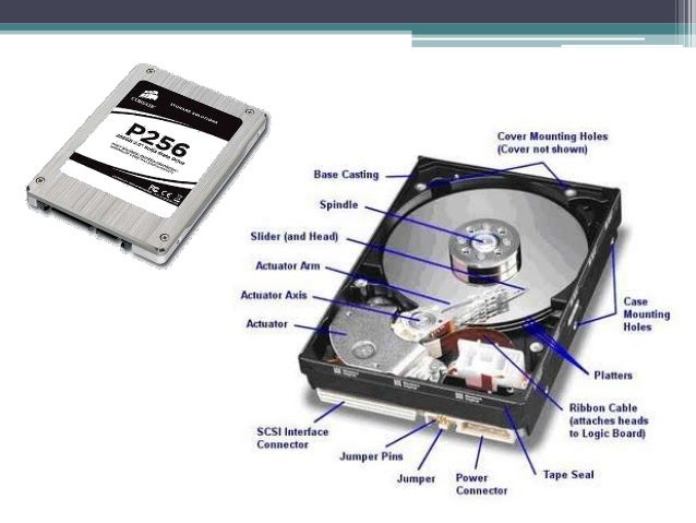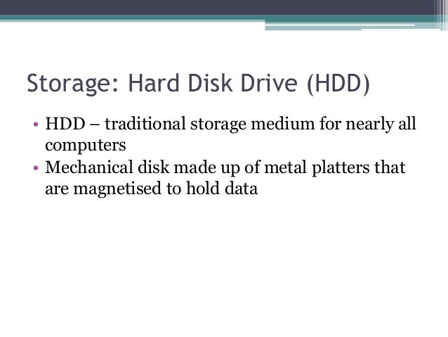 - 17. Storage: Hard Disk Drive (HDD) • HDD – traditional storage medium for nearly all computers • Mechanical disk made up of metal platters that are magnetised to hold data