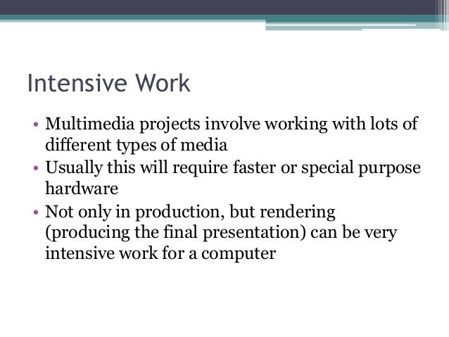 - 2. Intensive Work • Multimedia projects involve working with lots of different types of media • Usually this will require faster or special purpose hardware • Not only in production, but rendering (producing the final presentation) can be very intensive work for a computer