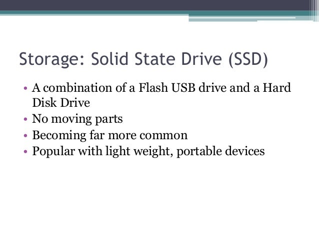 - 18. Storage: Solid State Drive (SSD) • A combination of a Flash USB drive and a Hard Disk Drive • No moving parts • Becoming far more common • Popular with light weight, portable devices