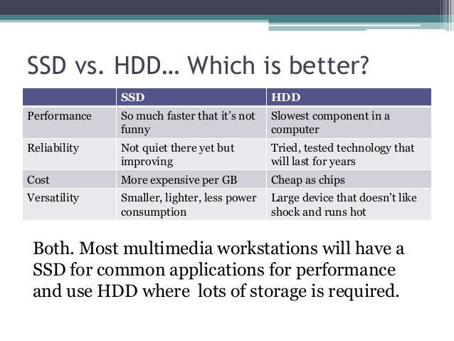 - 19. SSD vs. HDD… Which is better? SSD HDD Performance So much faster that it’s not funny Slowest component in a computer Reliability Not quiet there yet but improving Tried, tested technology that will last for years Cost More expensive per GB Cheap as chips Versatility Smaller, lighter, less power consumption Large device that doesn’t like shock and runs hot Both. Most multimedia workstations will have a SSD for common applications for performance and use HDD where lots of storage is required.