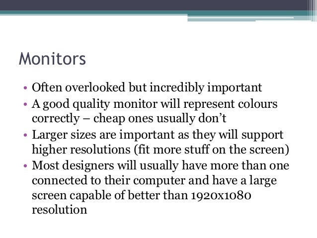 - 20. Monitors • Often overlooked but incredibly important • A good quality monitor will represent colours correctly – cheap ones usually don’t • Larger sizes are important as they will support higher resolutions (fit more stuff on the screen) • Most designers will usually have more than one connected to their computer and have a large screen capable of better than 1920x1080 resolution