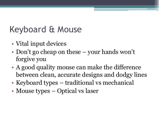 - 21. Keyboard & Mouse • Vital input devices • Don’t go cheap on these – your hands won’t forgive you • A good quality mouse can make the difference between clean, accurate designs and dodgy lines • Keyboard types – traditional vs mechanical • Mouse types – Optical vs laser