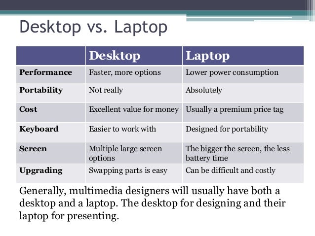 - 3. Desktop vs. Laptop Desktop Laptop Performance Faster, more options Lower power consumption Portability Not really Absolutely Cost Excellent value for money Usually a premium price tag Keyboard Easier to work with Designed for portability Screen Multiple large screen options The bigger the screen, the less battery time Upgrading Swapping parts is easy Can be difficult and costly Generally, multimedia designers will usually have both a desktop and a laptop. The desktop for designing and their laptop for presenting.