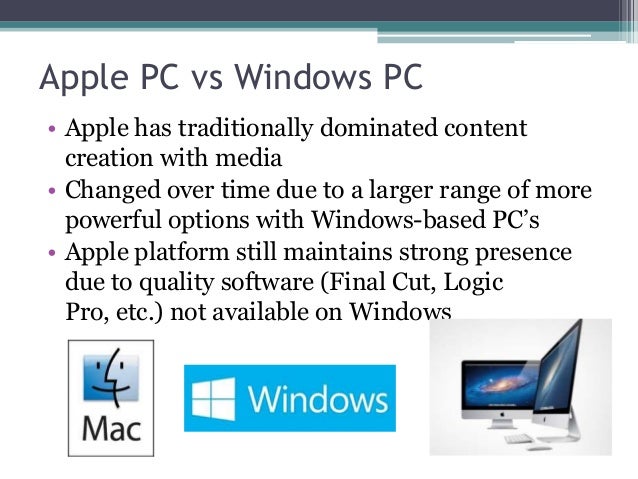 - 4. Apple PC vs Windows PC • Apple has traditionally dominated content creation with media • Changed over time due to a larger range of more powerful options with Windows-based PC’s • Apple platform still maintains strong presence due to quality software (Final Cut, Logic Pro, etc.) not available on Windows