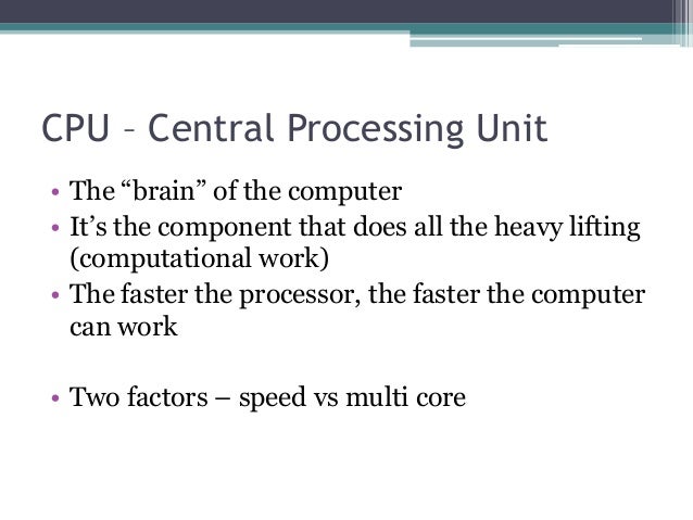 - 5. CPU – Central Processing Unit • The “brain” of the computer • It’s the component that does all the heavy lifting (computational work) • The faster the processor, the faster the computer can work • Two factors – speed vs multi core