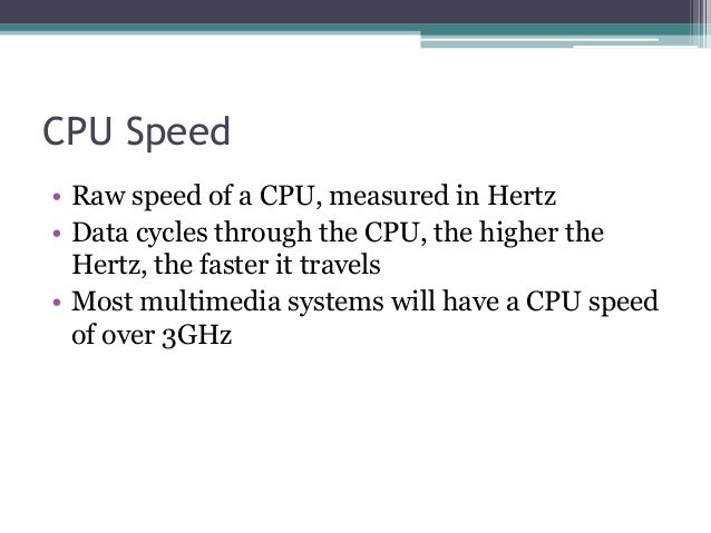 - 6. CPU Speed • Raw speed of a CPU, measured in Hertz • Data cycles through the CPU, the higher the Hertz, the faster it travels • Most multimedia systems will have a CPU speed of over 3GHz