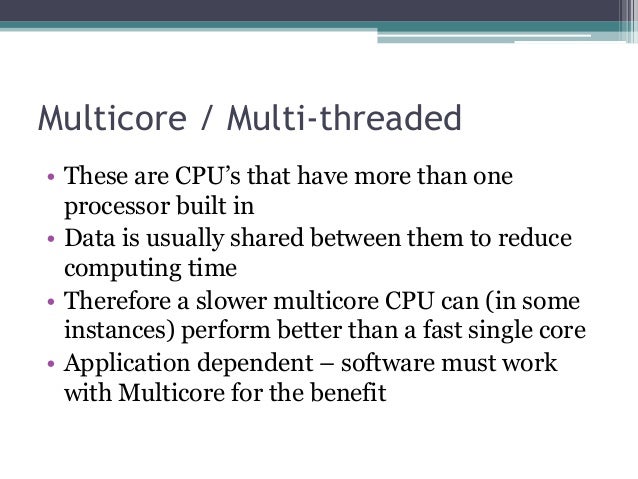 - 7. Multicore / Multi-threaded • These are CPU’s that have more than one processor built in • Data is usually shared between them to reduce computing time • Therefore a slower multicore CPU can (in some instances) perform better than a fast single core • Application dependent – software must work with Multicore for the benefit