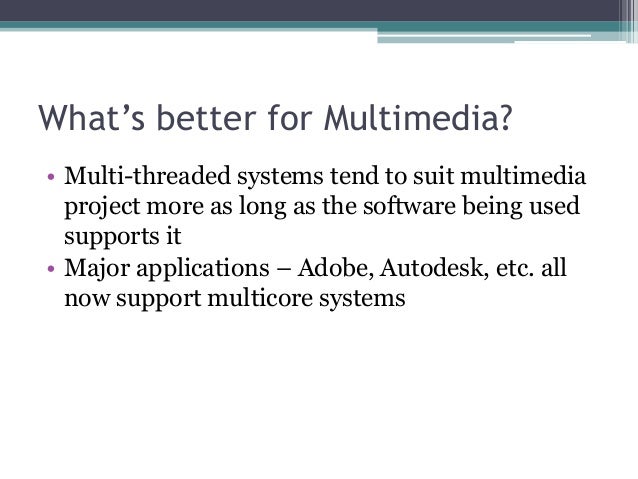 - 8. What’s better for Multimedia? • Multi-threaded systems tend to suit multimedia project more as long as the software being used supports it • Major applications – Adobe, Autodesk, etc. all now support multicore systems